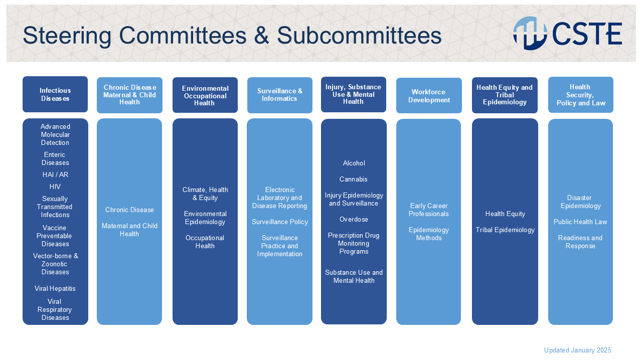 To contact the Program & Policy Committee, please email programandpolicy@cste.org. To view all of CSTE’s current Steering Committees and Subcommittees, visit the “Committee” menu. To contact the Program & Policy Committee, please email programandpolicy@cste.org. To view all of CSTE’s current Steering Committees and Subcommittees, visit the “Committee” menu. |
